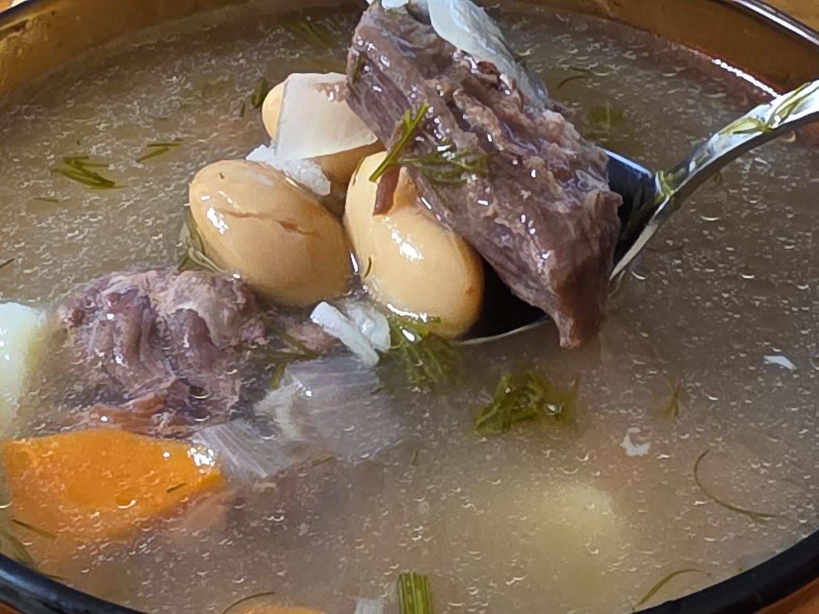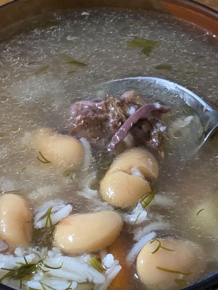 Наваристый суп, где тушеная говядина дает «правильный» мясной бульон, рис делает блюдо нежным, а фасоль — густым и очень сытным. Идеально на обед/ужин, когда нужно быстро и вкусно.