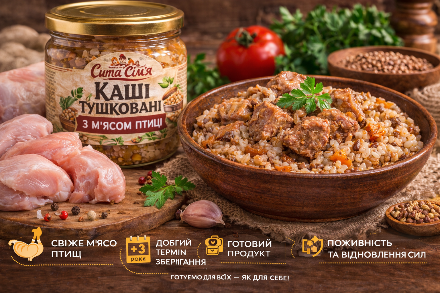 Це смачне та ситне поєднання м'яса птиці з гарніром, яке не потребує складного приготування. Продукт зручно брати із собою в дорогу, на природу, у подорожі, на риболовлю чи в похід. Завдяки тривалому терміну зберігання каші тушковані з м'ясом птиці залишаються практичним рішенням для швидкого, поживного та повноцінного харчування в будь-яких умовах.