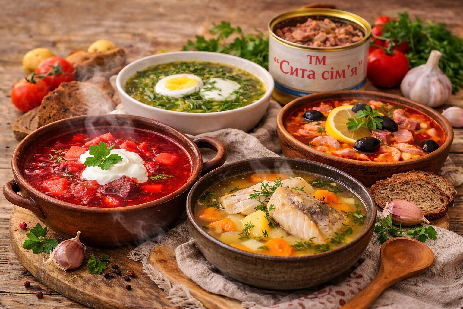 Спробуйте класичний український борщ, зелений борщ зі щавлем, ароматний гречаний суп або ситний гороховий суп.